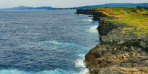 The scene is from the Cape Zanpa Lighthouse located in Okinawa, Japan.
